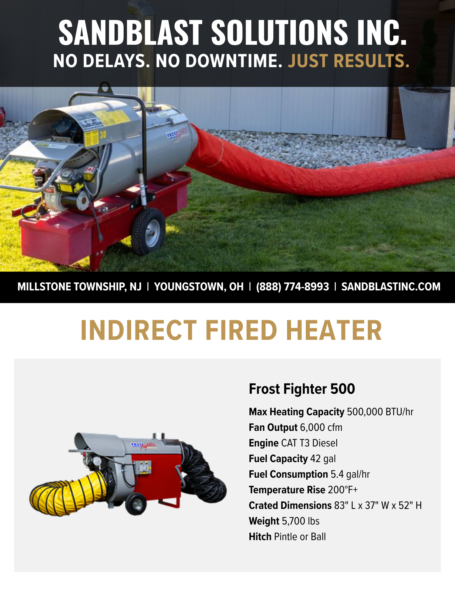 The IDF500 comes standard with many features designed for safety, performance, and efficiency not found on competitive systems. These include a fully-insulated jacket, industrial grade burner, stainless steel heat exchanger, satin-coated steel with powder-coated paint, independent fan and blower, heavy-duty 6-ply pneumatic tires, polarity and running lights, and a flexible duct attachment. Ductable up to 50ft.
