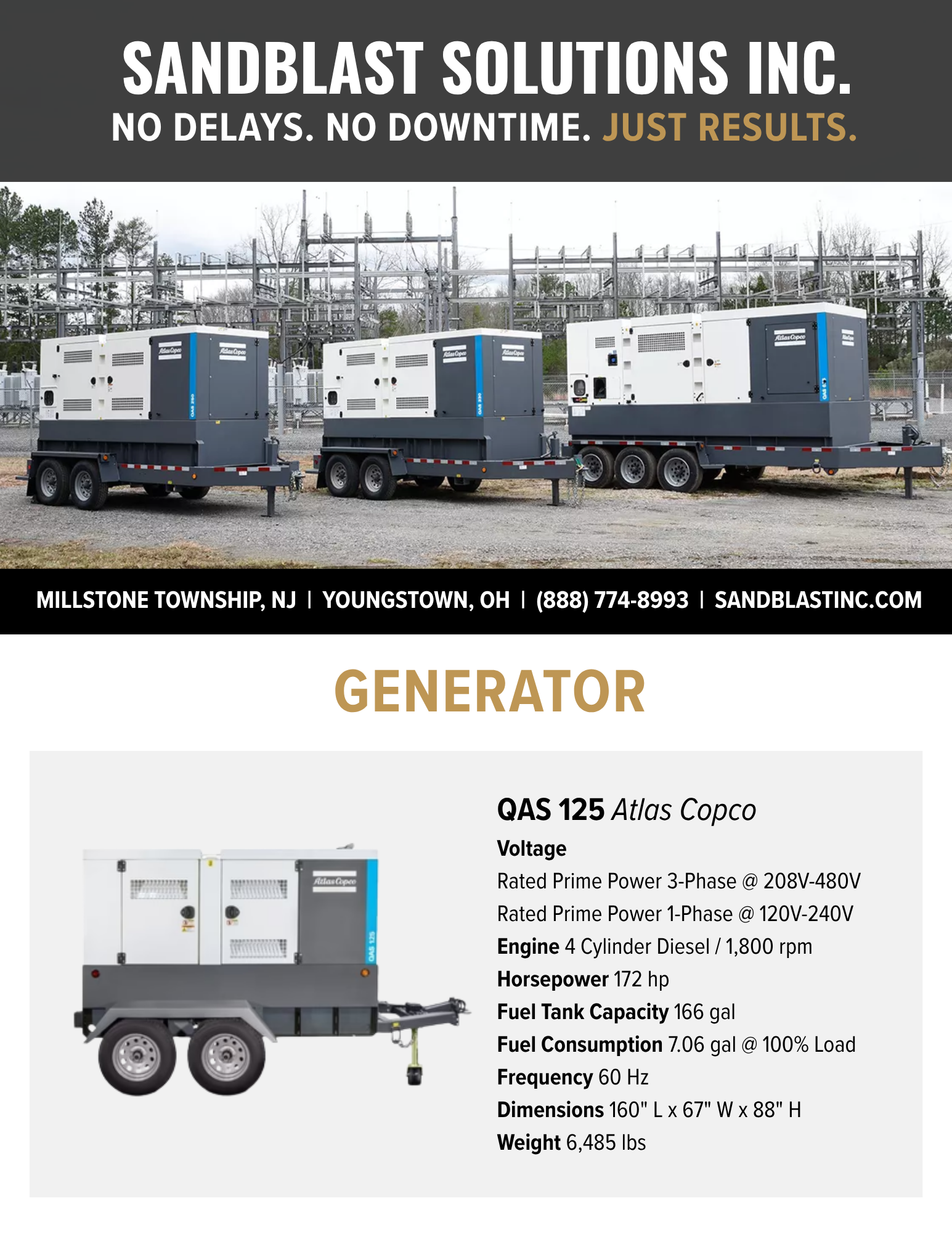 The Atlas Copco QAS 125 generators are prime power, multi-voltage, sound attenuated, mobile generators. They are powered by a John Deere T4 Final liquid-cooled, six-cylinder diesel engine.