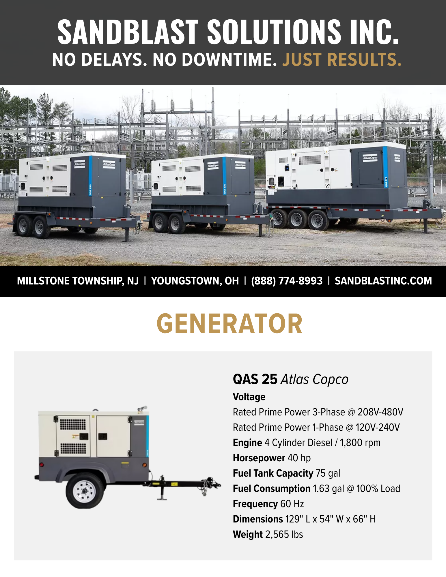 The Atlas Copco QAS 25 ID T4F generators are prime power, multi-voltage, sound attenuated, mobile generators. They are powered by an Isuzu Tier 4 Final, liquid-cooled, four cylinder diesel engine.