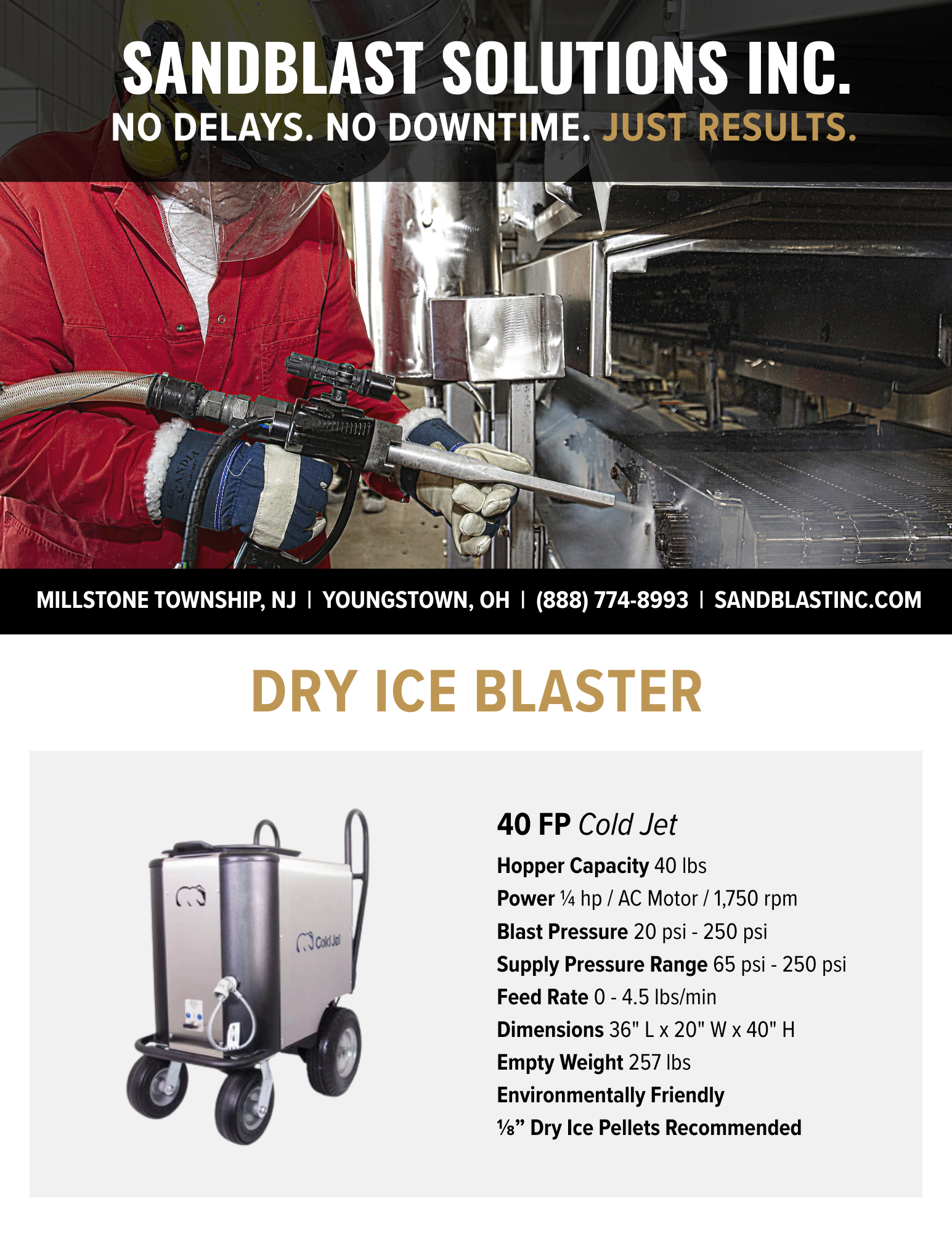 40FP Dry Ice BlasterCold Jet®DescriptionDry ice cleaning is non-abrasive, non-conductive, and non-toxic, giving several advantages over other cleaning methods. CO2 blasting is also chemical free, water free, and does not damage the substrate or create secondary waste streams. Cold Jet equipment features unparalleled technology that can be used in a variety of industries and applications. 1/8" dry ice pellets recommended. Rental Includes: - 2 Standard Nozzles