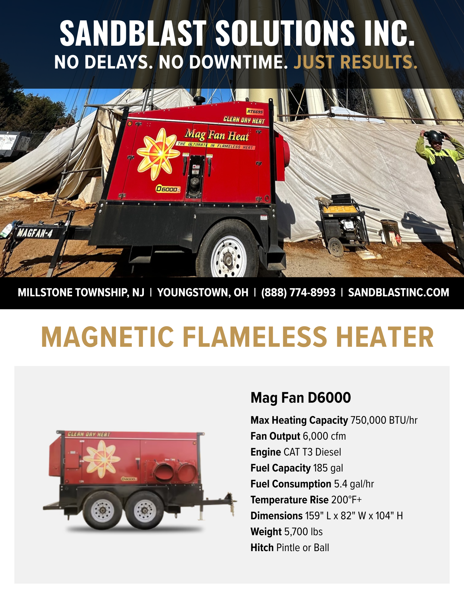 The Mag Fan D6000 uses magnetic heat to generate high volumes of humidity-free, low emissions heat for almost any large area. This economical heating solution quickly produces a tremendous amount of fast dry heat, without the use of spark, friction or flame. A safer alternative to an incineration device attached to a boiler, this flameless heater’s efficiency rating is over 90 percent in many environments and weather conditions.
