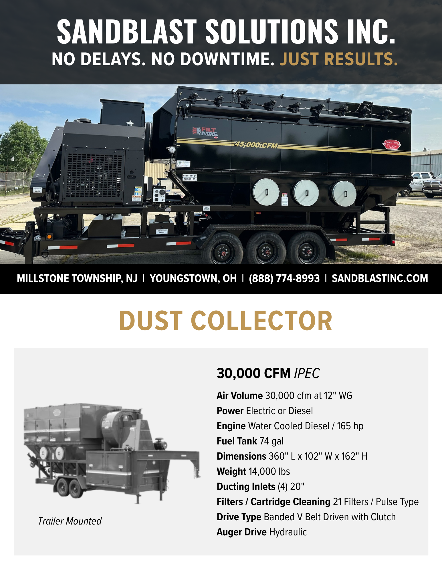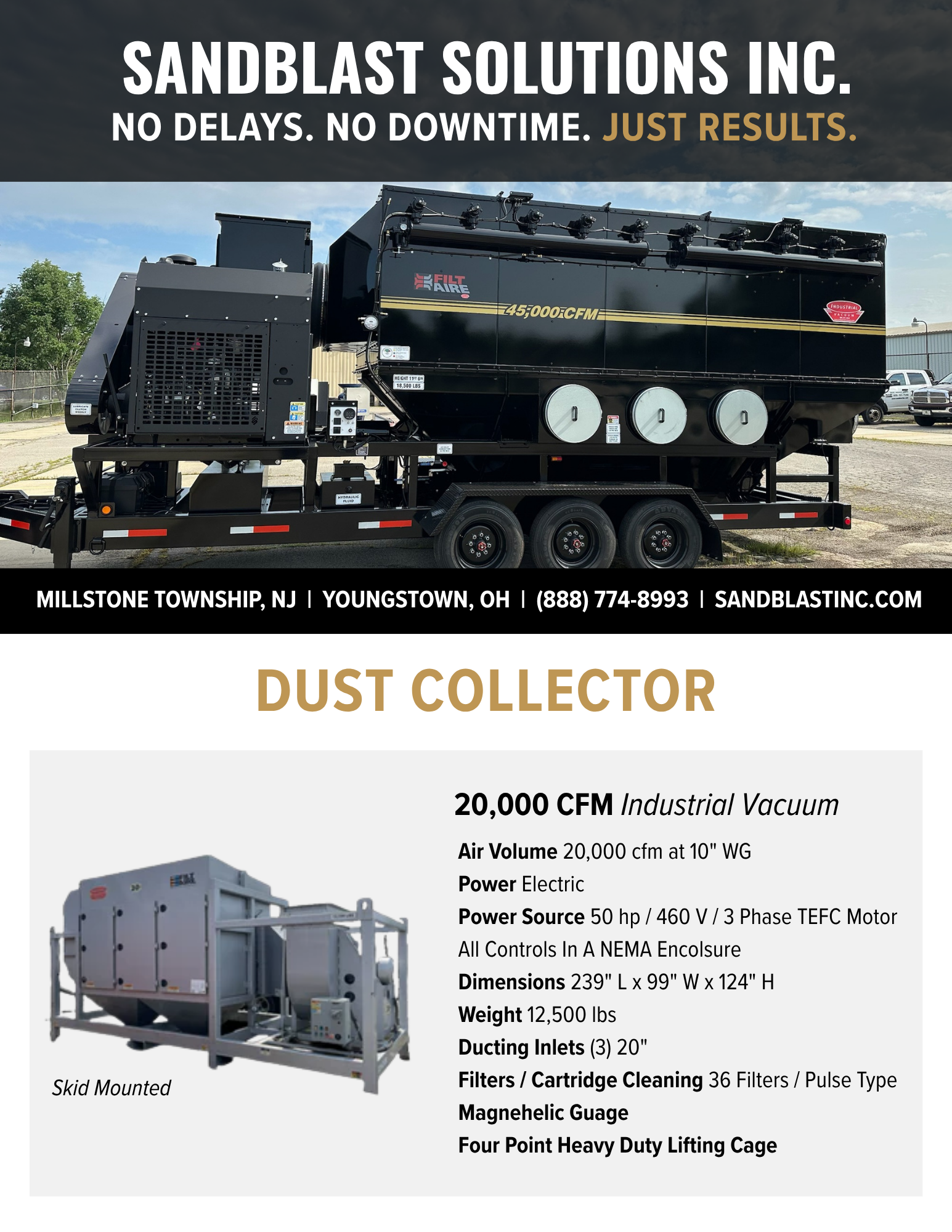 Ideal for medium sized jobs where a large dust collector won't fit. Can be used for indoor and outdoor applications. Available in Electric. Height Stowed 124", Height Raised 164". Unit is stationary, crane needed to offload.