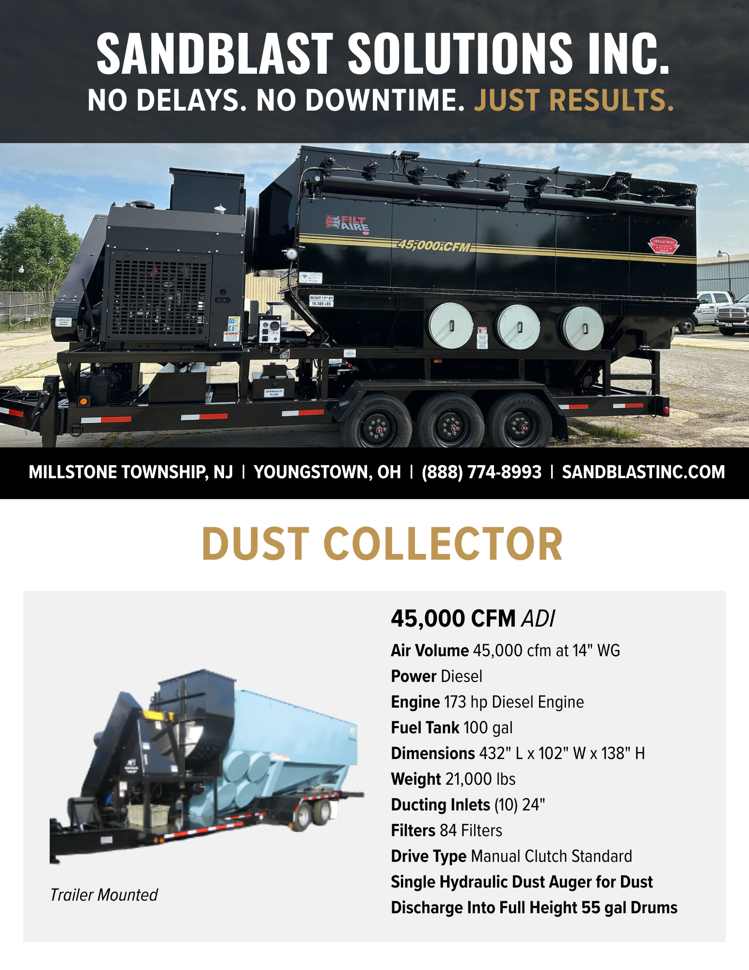 - Provides negative pressure to aid in collecting silica and other airborne abrasive dust