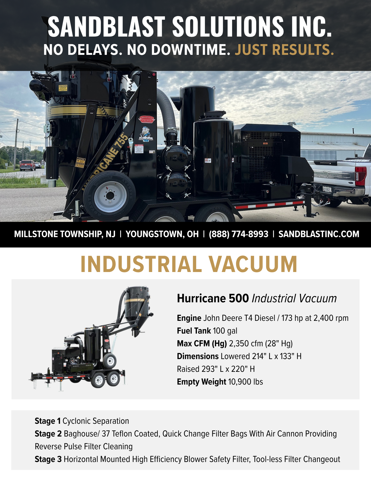 The Hurricane 500 is a powerful industrial vacuum designed to handle the toughest cleanup tasks across various industries. Built for efficiency and durability, this vacuum delivers exceptional suction power, making it perfect for removing heavy debris, abrasive materials, and other bulk waste from job sites. Equipped with a robust filtration system and easy-to-operate controls, it ensures safe, efficient cleanup with minimal downtime.