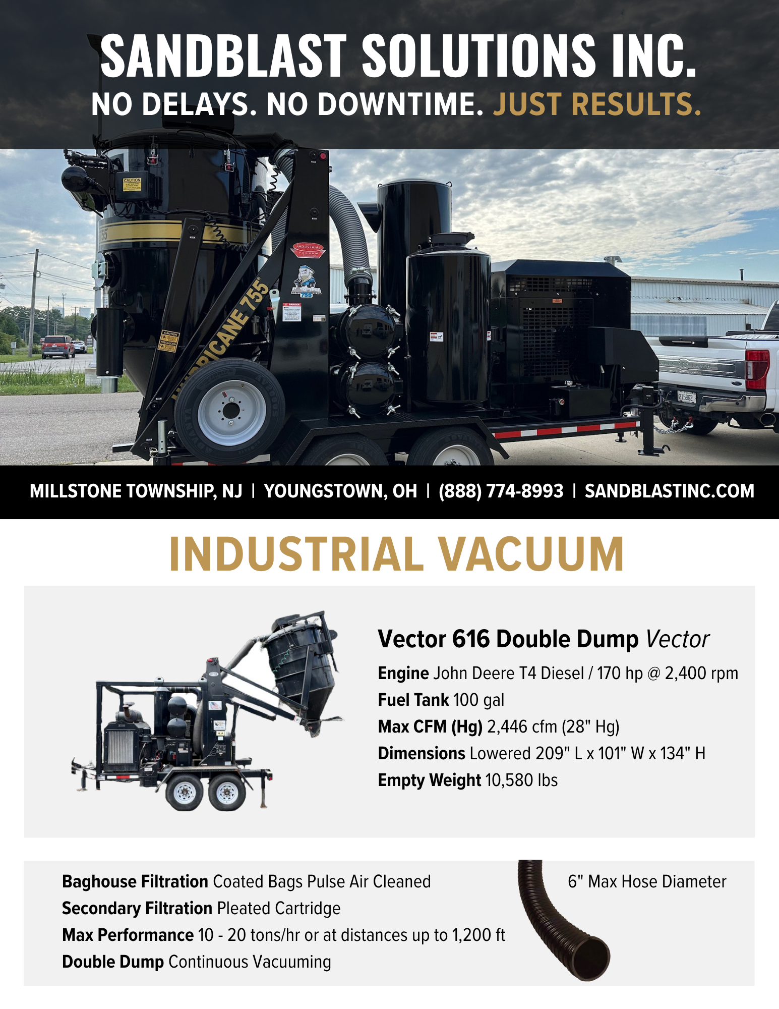 The Vector 616 Double Dump Vacuum is a heavy-duty industrial vacuum system designed for the toughest material handling and debris recovery tasks. Equipped with double dump technology, this vacuum allows continuous operation by alternating material discharge without stopping the suction process, maximizing productivity on demanding job sites.