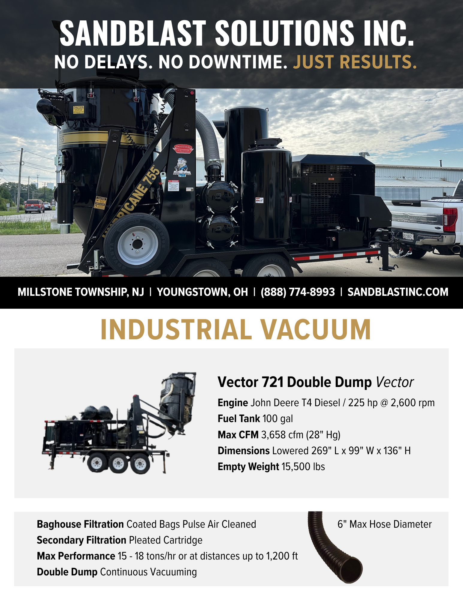 The Vector 721 Double Dump Vacuum is a heavy-duty industrial vacuum system designed for the toughest material handling and debris recovery tasks. Equipped with double dump technology, this vacuum allows continuous operation by alternating material discharge without stopping the suction process, maximizing productivity on demanding job sites.